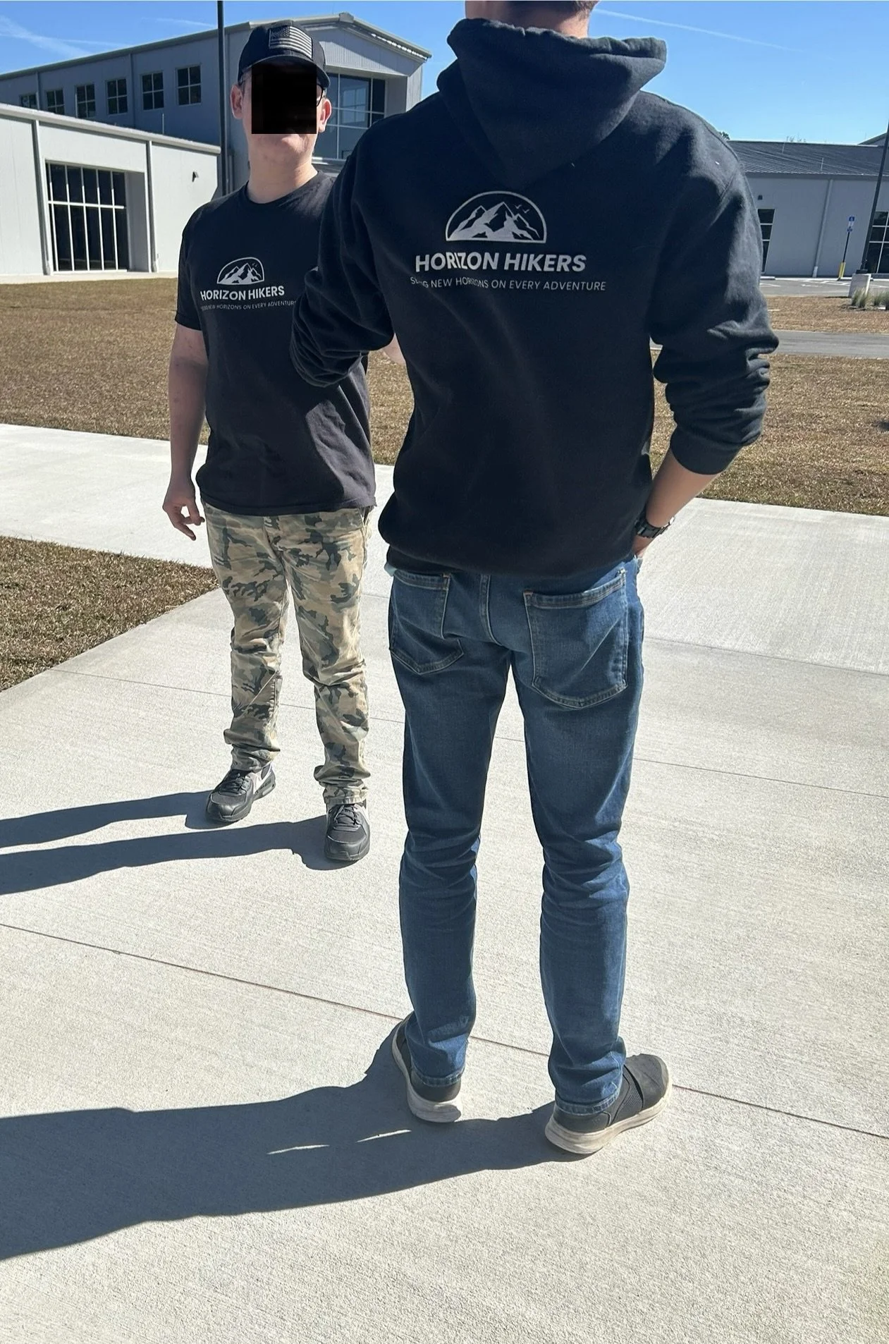 Two people standing outdoors on a concrete sidewalk. Both are wearing black hoodies with the text "Horizon Hikers" and a mountain logo. One person faces away with hands in pockets, the other faces forward. The person facing forward wears camouflage p