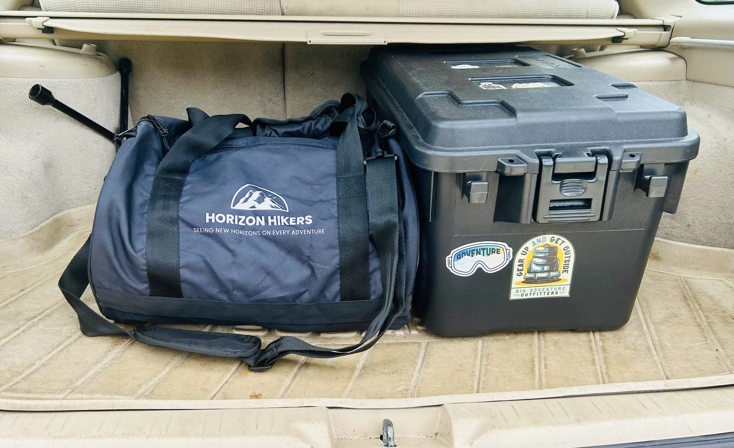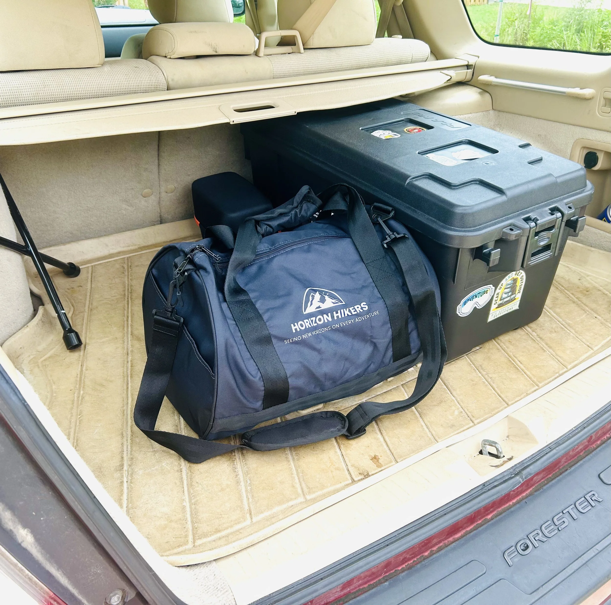 The trunk of a vehicle containing a blue Horizon Hikers duffel bag, a black storage container, and a beige car mat, with the vehicle's beige interior and rear seats visible.
