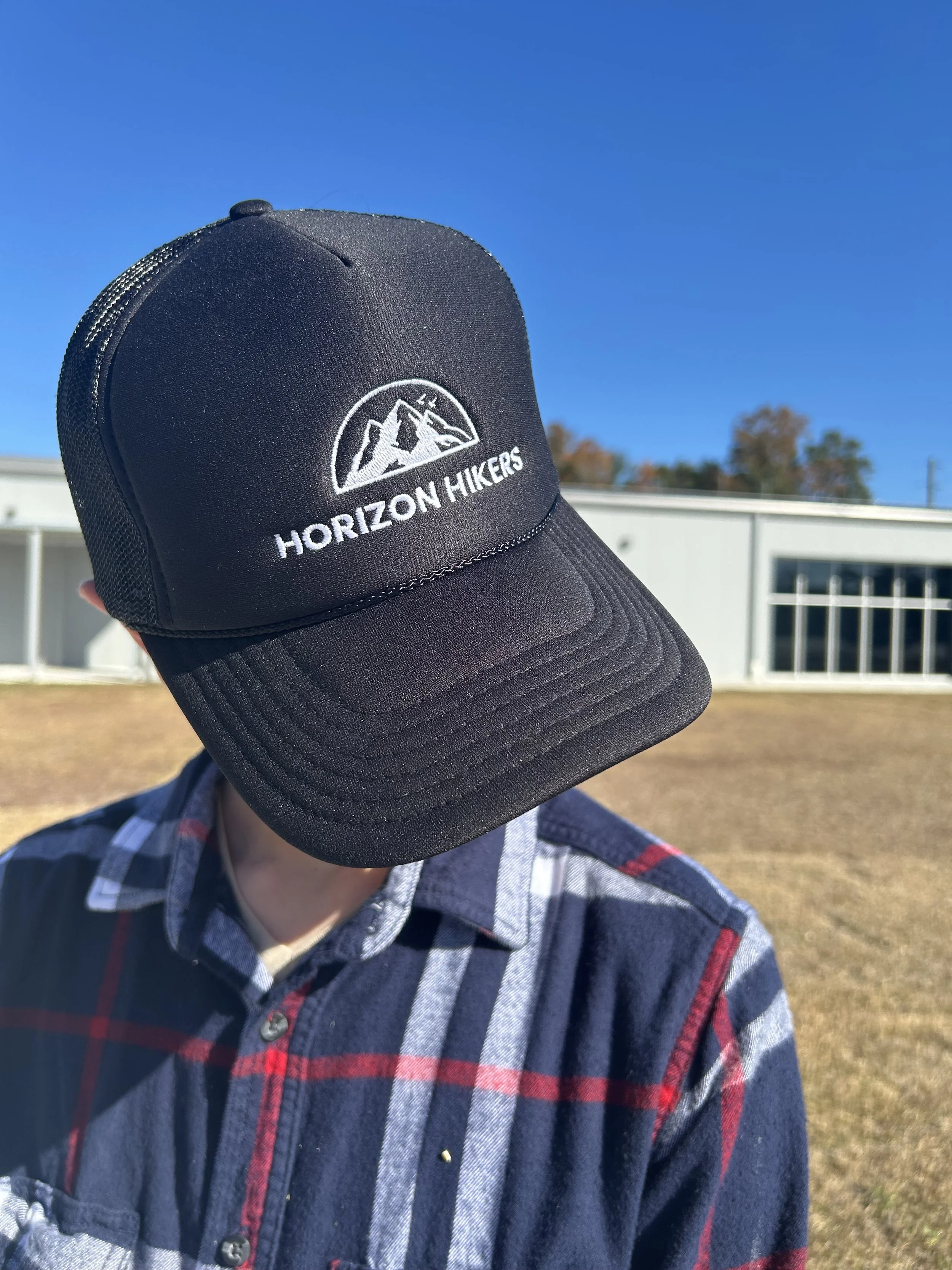 Person wearing a black baseball cap with 'Horizon Hikers' logo and text, standing outdoors on a sunny day with a building and trees in the background.