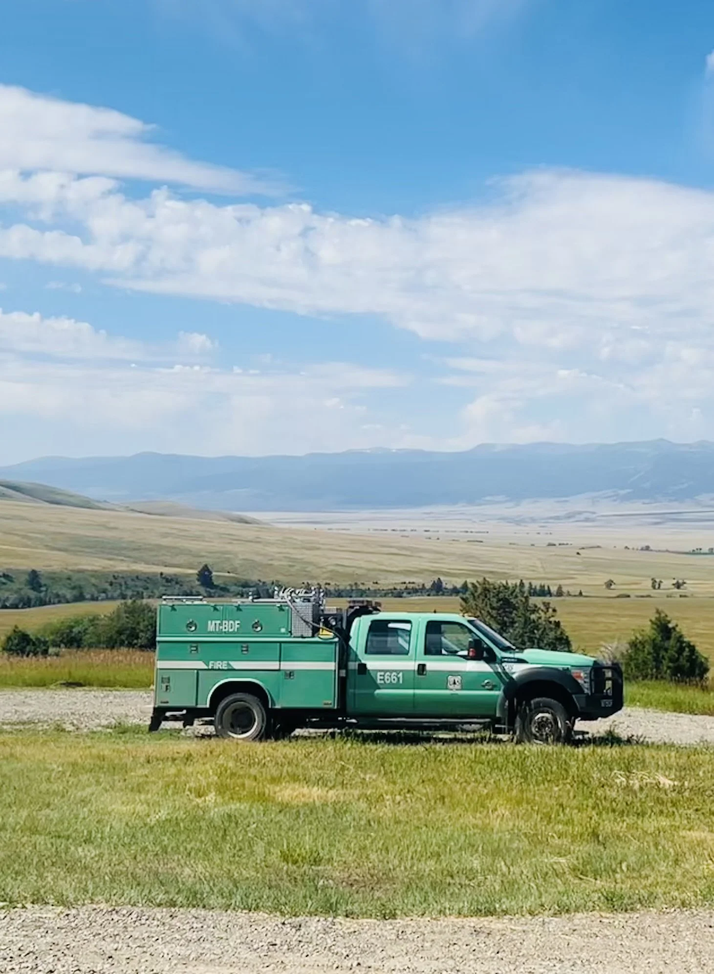 A green fire rescue truck parked on grass with open fields, distant mountains, and a partly cloudy blue sky in the background.