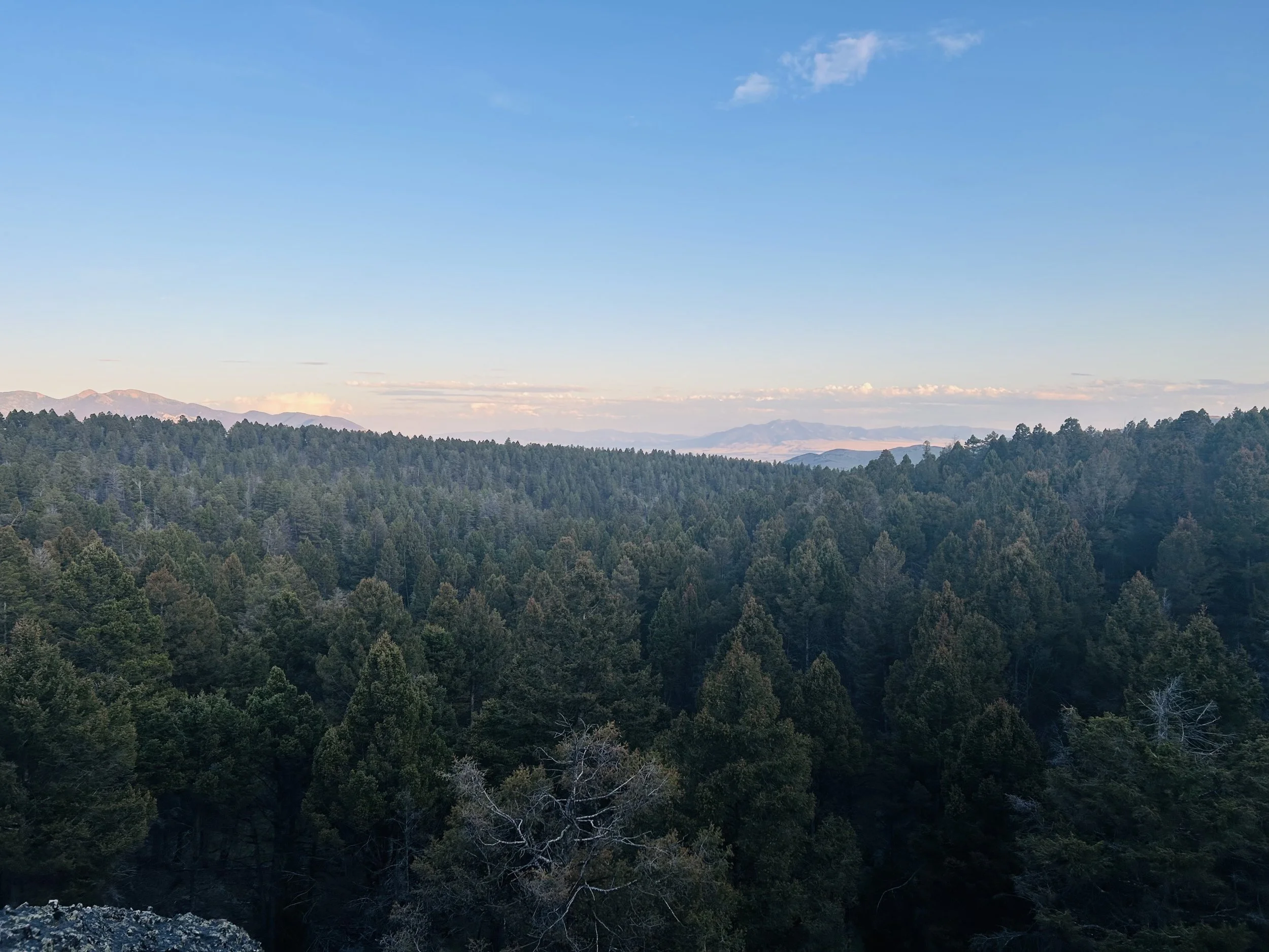 View of a dense forest with rolling hills and distant mountains under a clear sky.