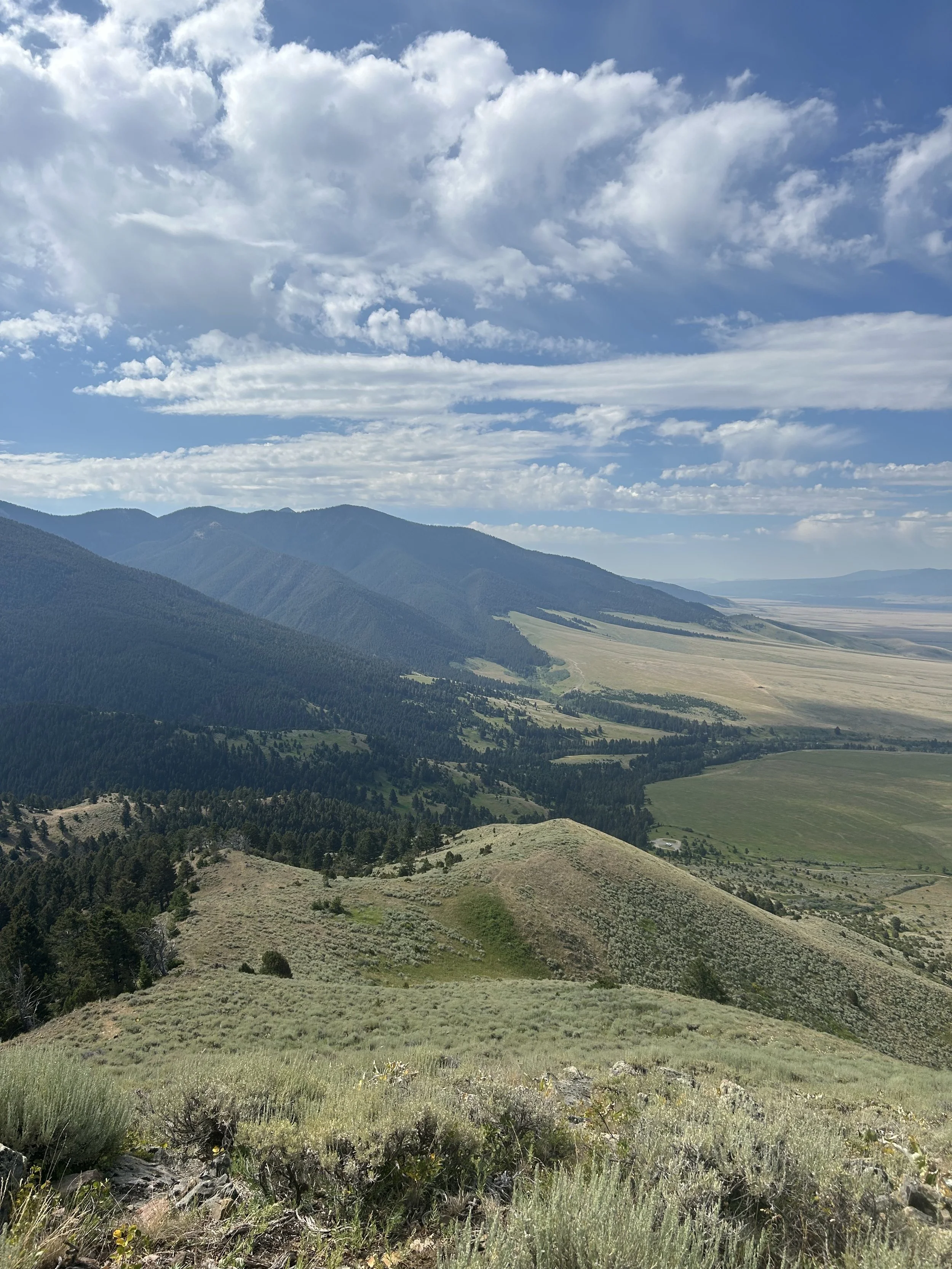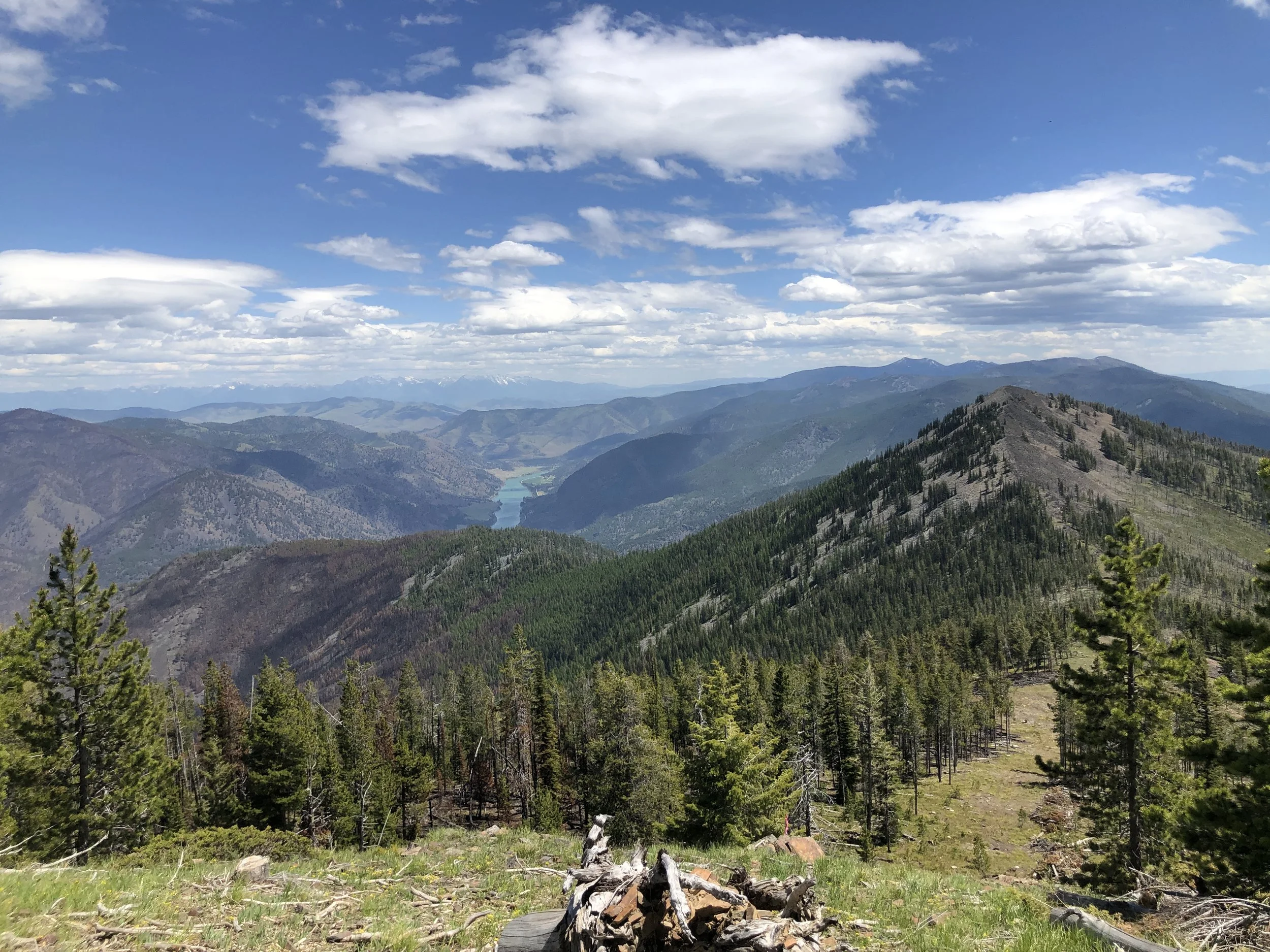 Person resting on a mountain trail overlooking a forested valley with lakes and distant mountains.